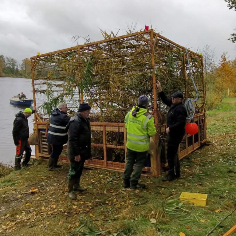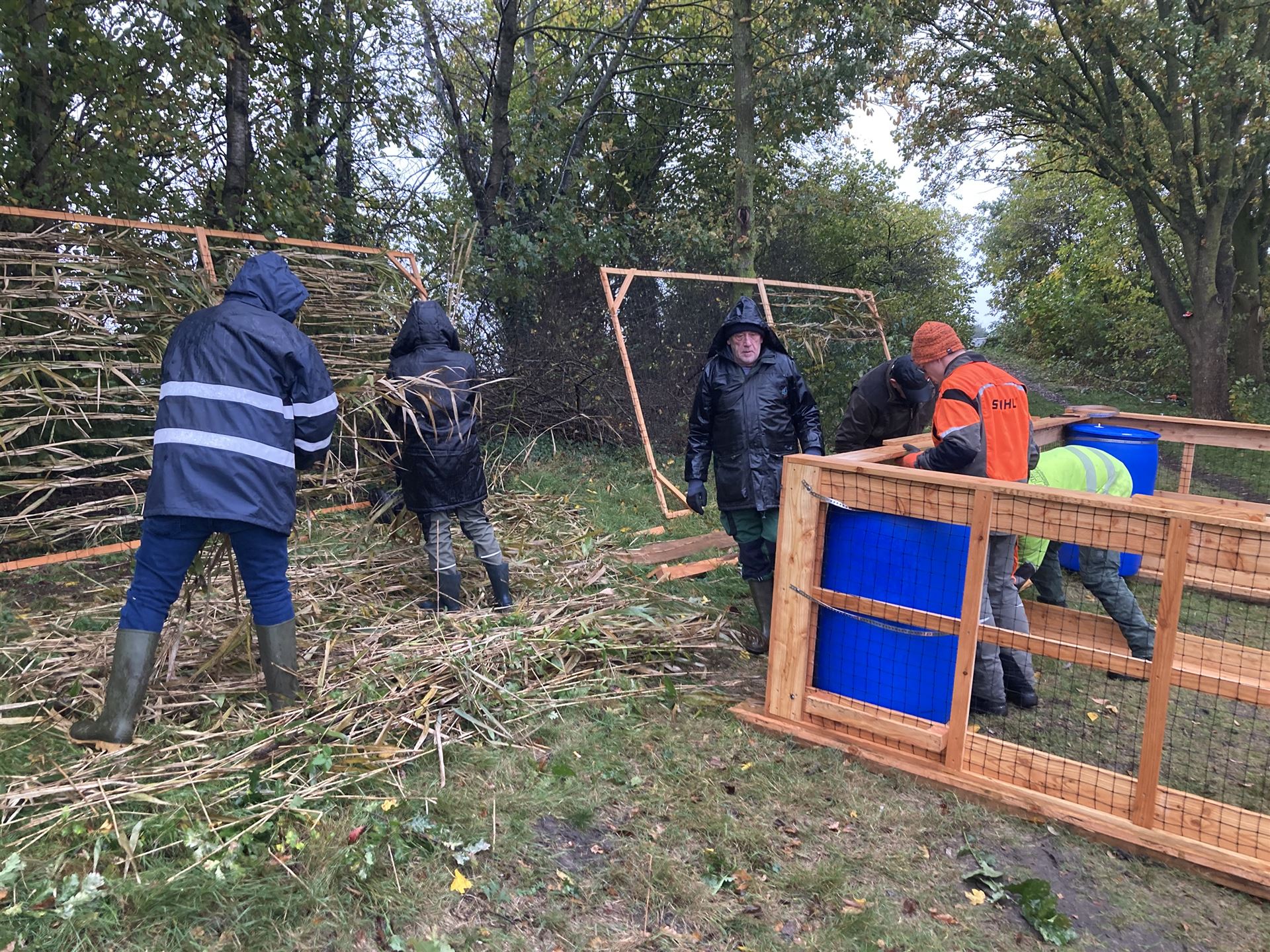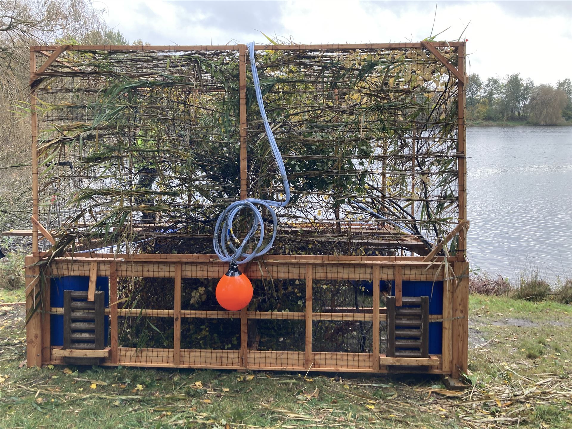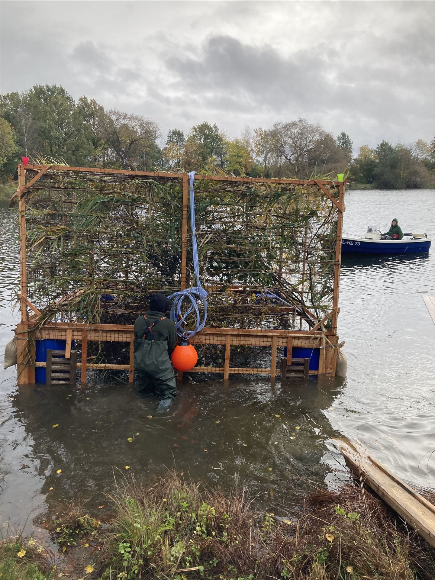 In das Netz wurde von den eifrigen Helfern bei widrigen Wetterbedingungen mühselig frisch geschnittenes Schilf eingeflochten, um das ganze etwas abzudunkeln, damit die Fische dies als Schutzzone wahrnehmen.