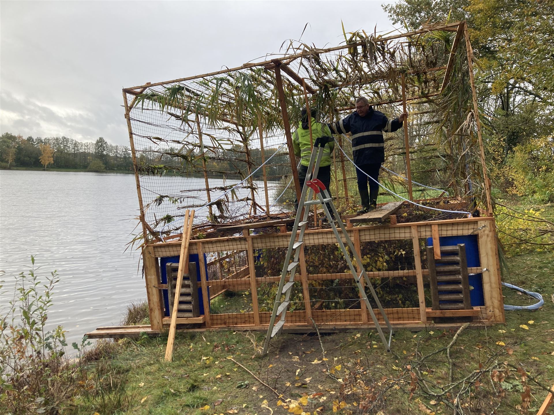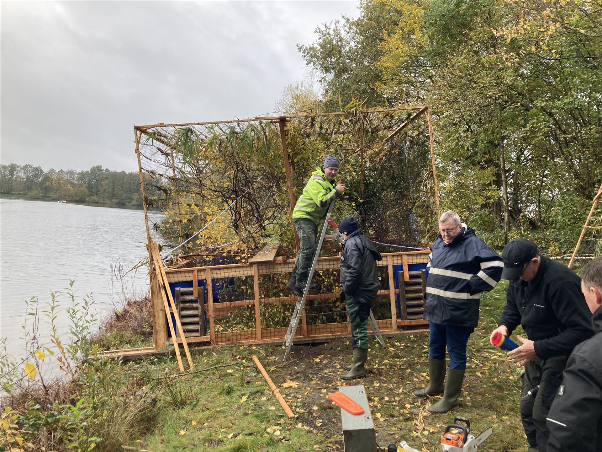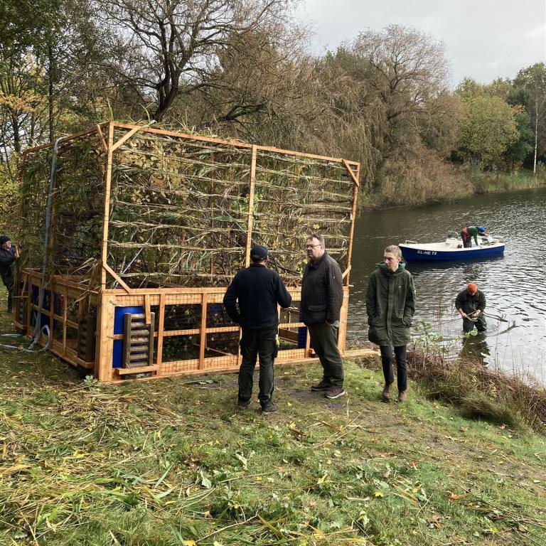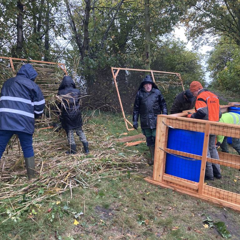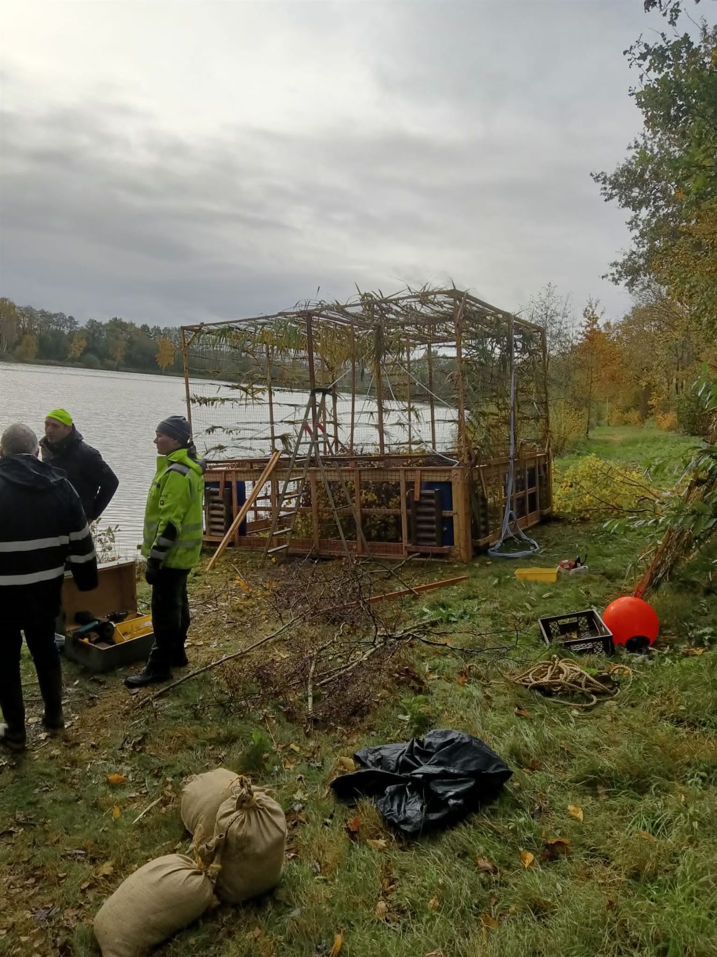 In das Netz wurde von den eifrigen Helfern bei widrigen Wetterbedingungen mühselig frisch geschnittenes Schilf eingeflochten, um das ganze etwas abzudunkeln, damit die Fische dies als Schutzzone wahrnehmen.