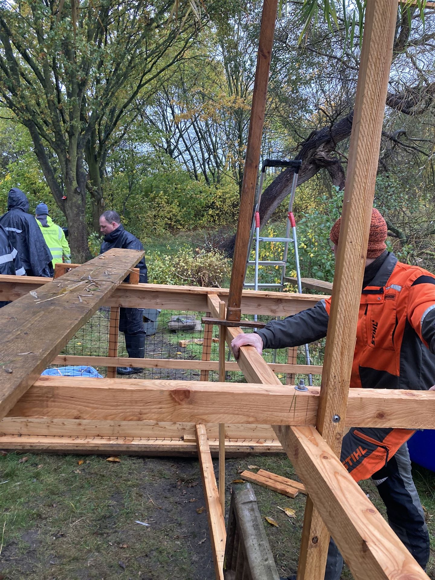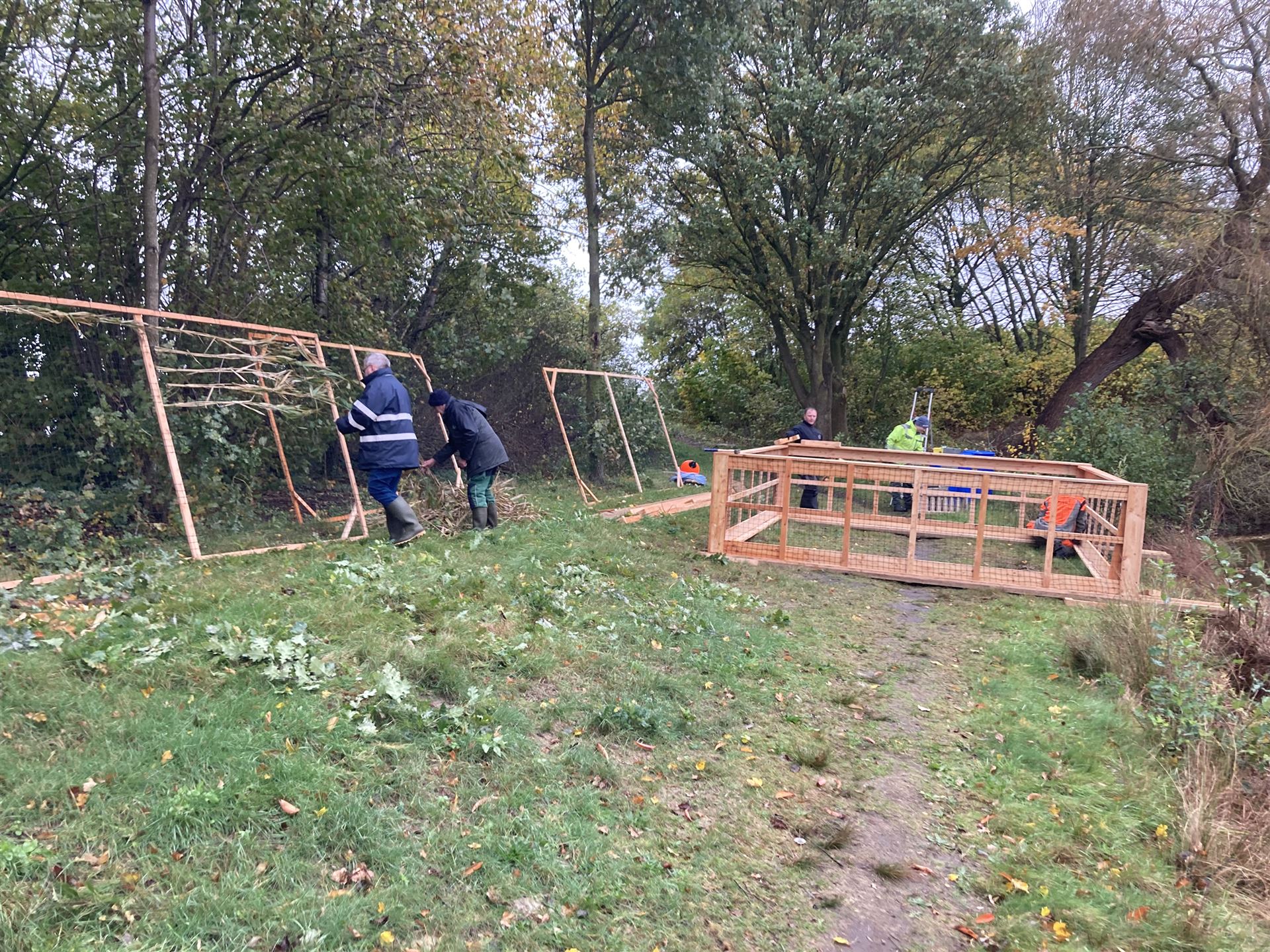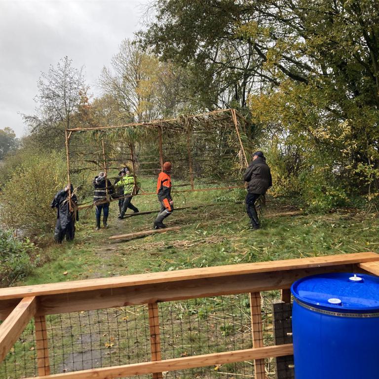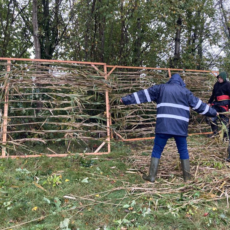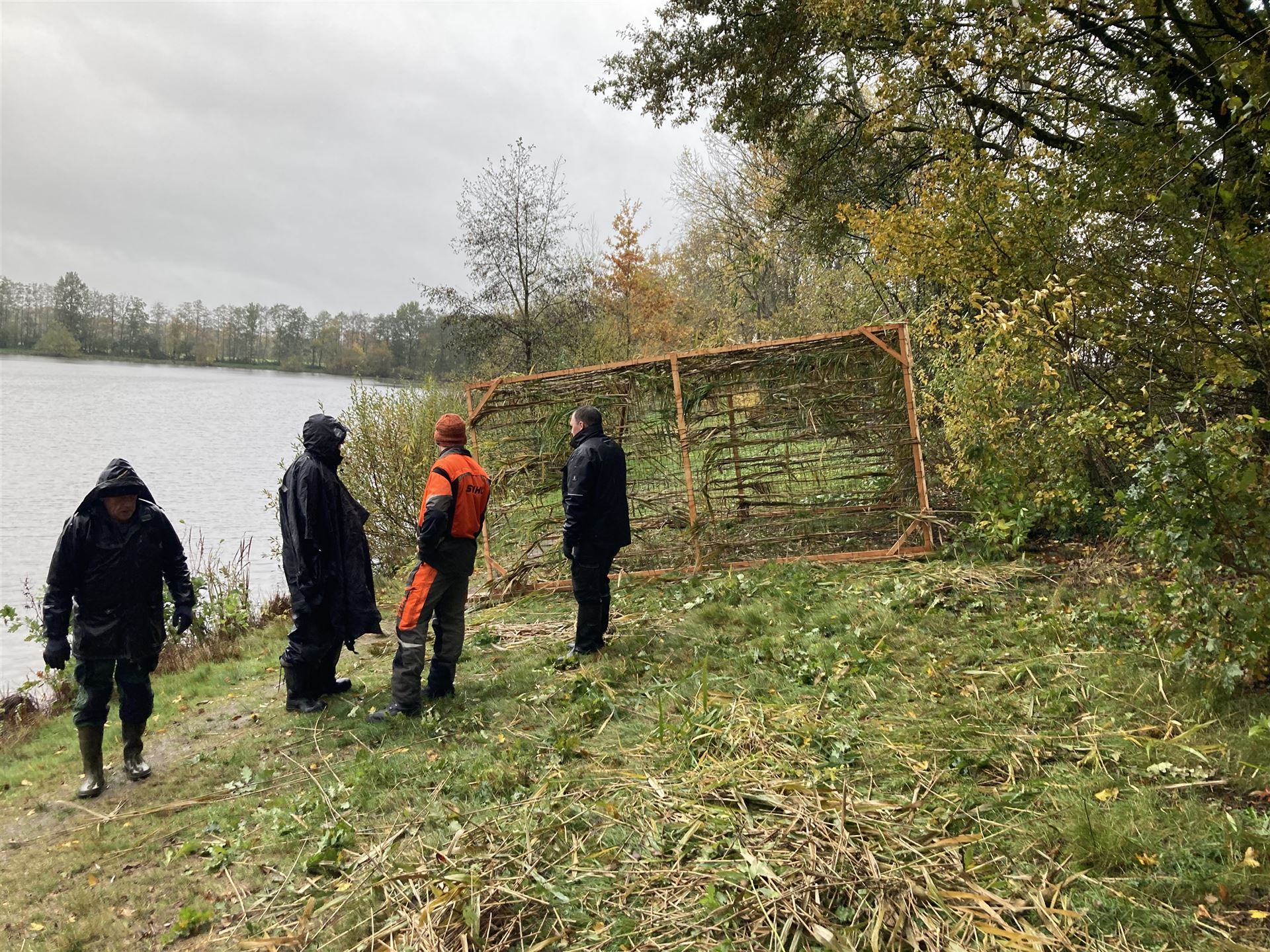 In das Netz wurde von den eifrigen Helfern bei widrigen Wetterbedingungen mühselig frisch geschnittenes Schilf eingeflochten, um das ganze etwas abzudunkeln, damit die Fische dies als Schutzzone wahrnehmen.